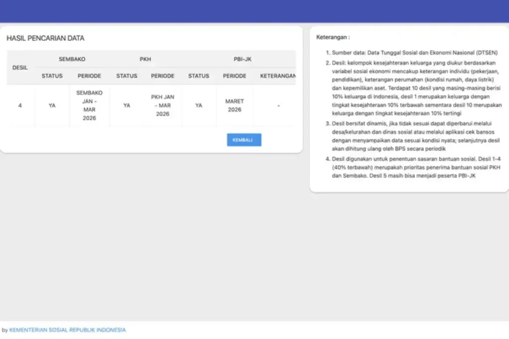 Hasil pencarian akan memuat informasi mengenai status penerima, jenis bantuan yang berhak diterima, kelompok desil penerima, serta periode pencairan bansos 2026.